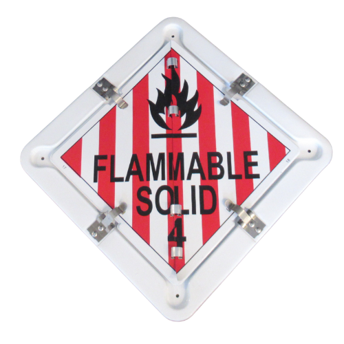 Diamond shaped dangerous good flip signage with 14 standard Dangerous Goods placards commonly required for road transport.